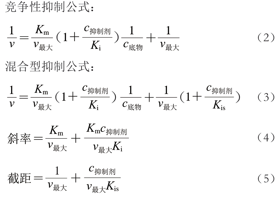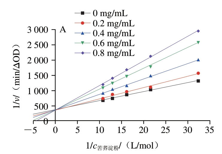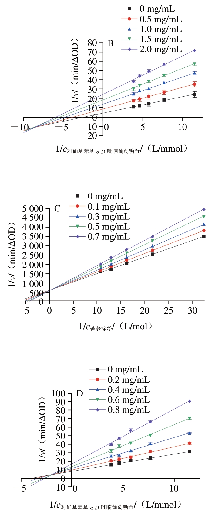 式(2)~(5)中:v为存在或不存在芦丁和槲皮素时的酶促反应速率;v最大为最大酶反应速率;c底物为苦荞淀粉和对硝基苯基-α-D-吡喃葡萄糖苷浓度;c抑制剂为芦丁和槲皮素质量浓度;Km为米氏常数;Ki为抑制剂与酶结合的平衡常数;Kis为抑制剂与酶-底物复合物结合的平衡常数。