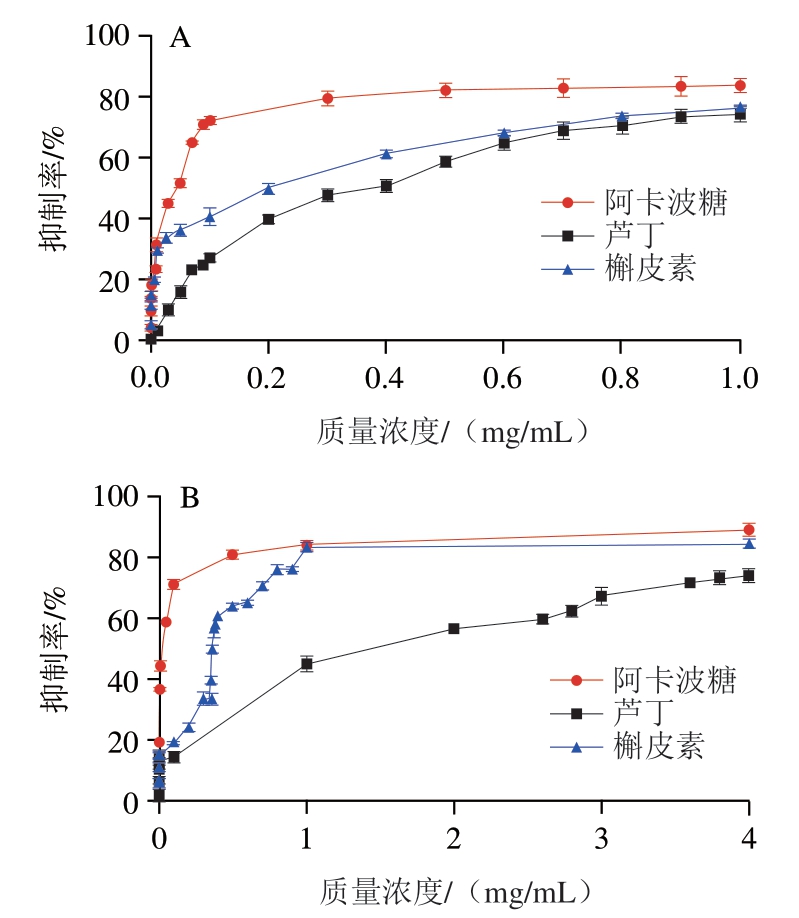 图1 芦丁和槲皮素对α-淀粉酶(A)和α-葡萄糖苷酶(B)的抑制曲线