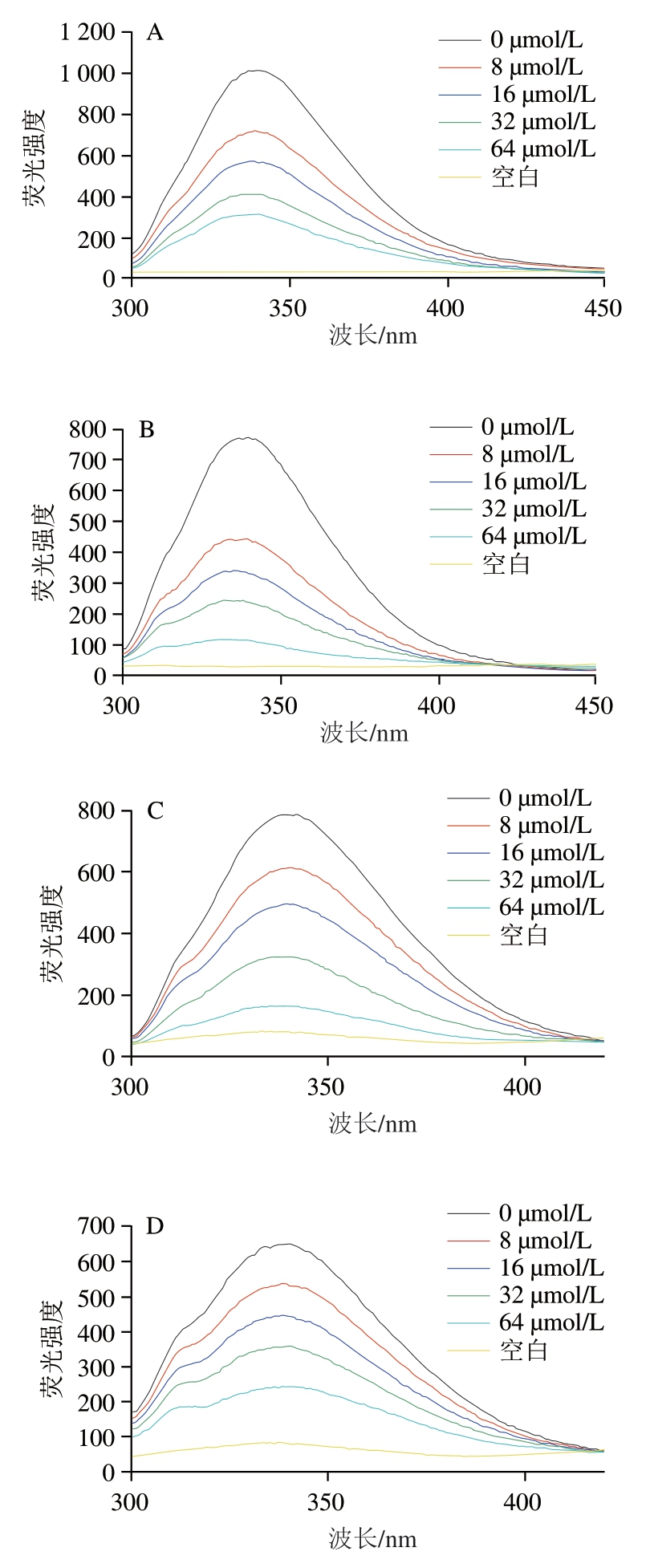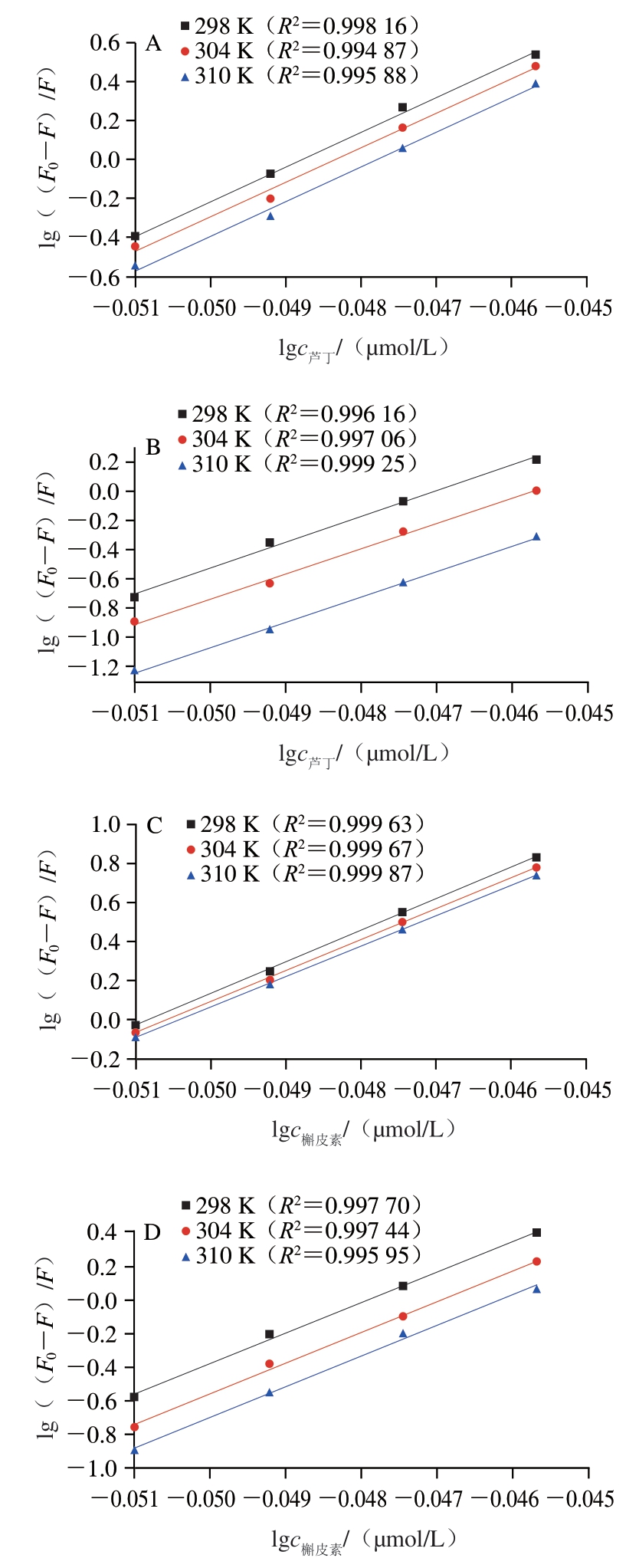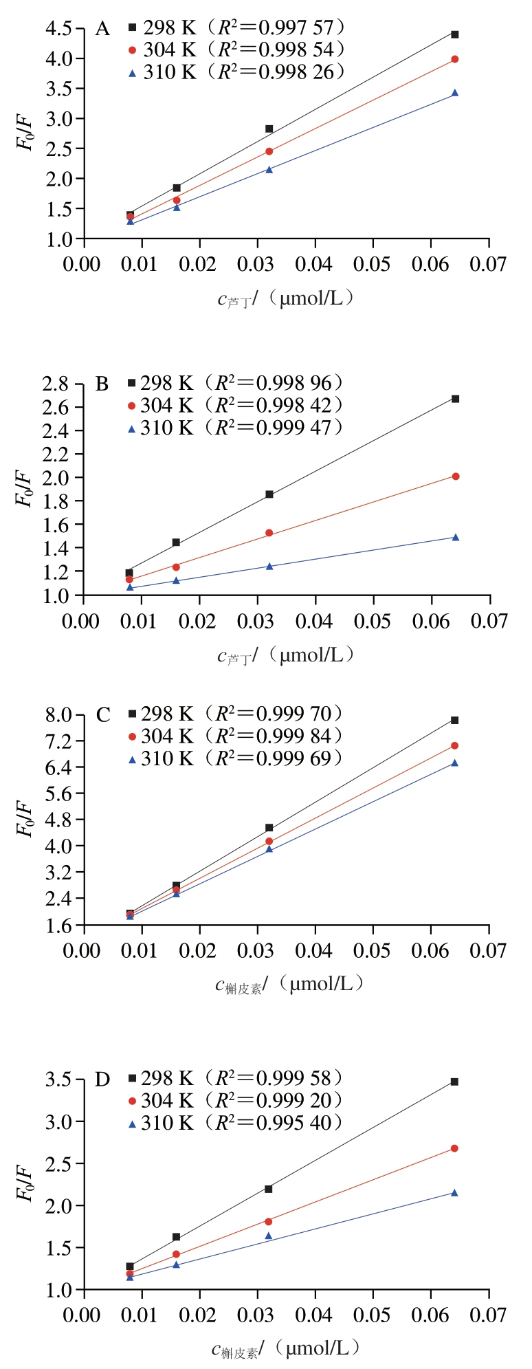 由图4可知,当测试温度298 K、激发波长280 nm时,α-淀粉酶和α-葡萄糖苷酶均在340 nm波长附近有最大发射峰(λmax)。当反应体系中加入不同浓度的芦丁和槲皮素,两种酶的荧光强度都展现出剂量依赖性的猝灭,且λmax发生不同程度的移动。如图4A和B所示,随着芦丁浓度的增加,α-淀粉酶和α-葡萄糖苷酶的λmax分别从340 nm移动到335 nm和332 nm;如图4C和D所示,随着槲皮素浓度的增加,α-淀粉酶和α-葡萄糖苷酶的λmax分别从342 nm和340 nm移动至338 nm。这种现象表明芦丁和槲皮素与α-淀粉酶和α-葡萄糖苷酶之间存在相互作用,导致氨基酸残基逐渐暴露在水溶液中,所处环境极性降低[28]。
