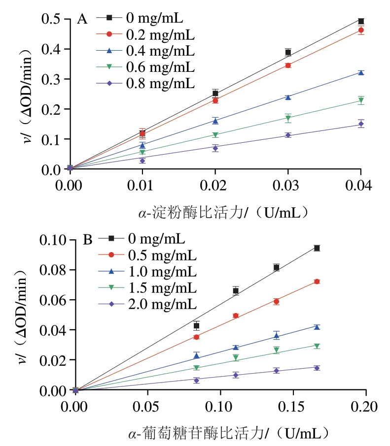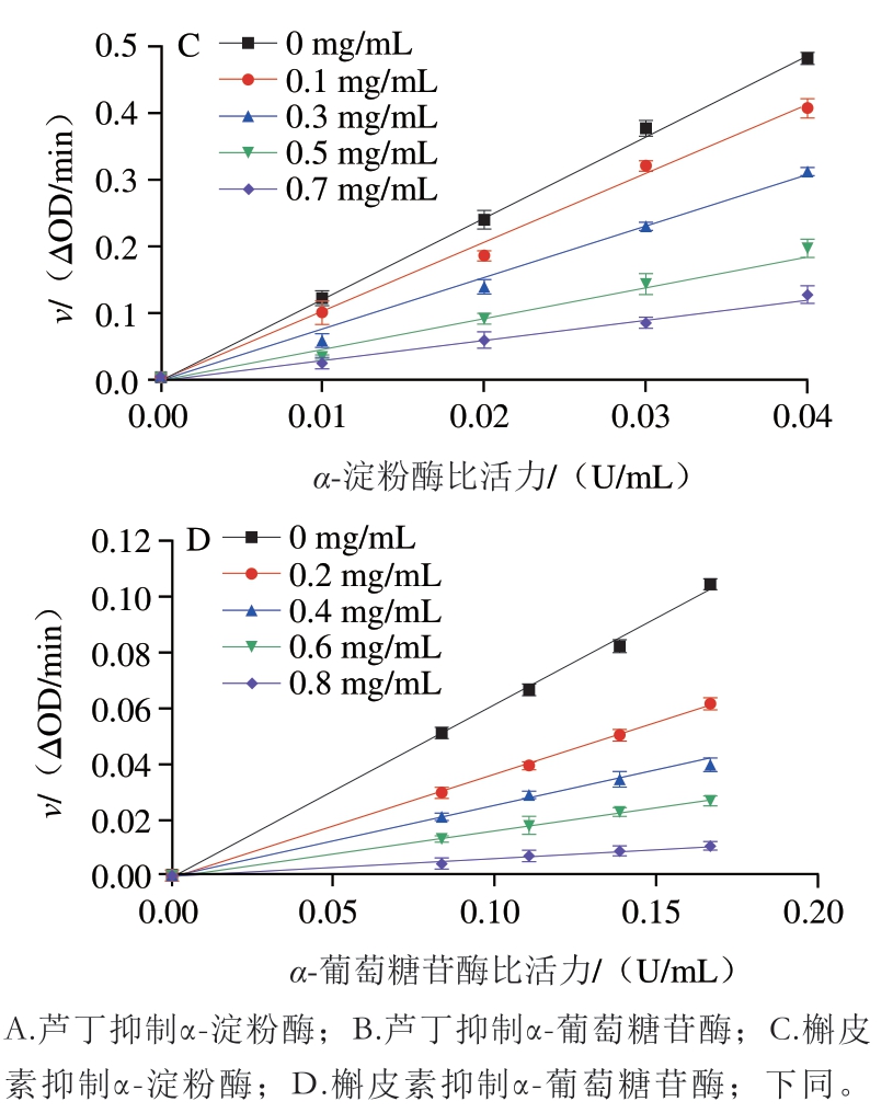由图2可知,不同质量浓度的芦丁和槲皮素都能得到一条通过原点的直线,且斜率随着质量浓度的增加而减小。由此可知,芦丁和槲皮素对α-淀粉酶和α-葡萄糖苷酶都属于可逆性抑制作用。
