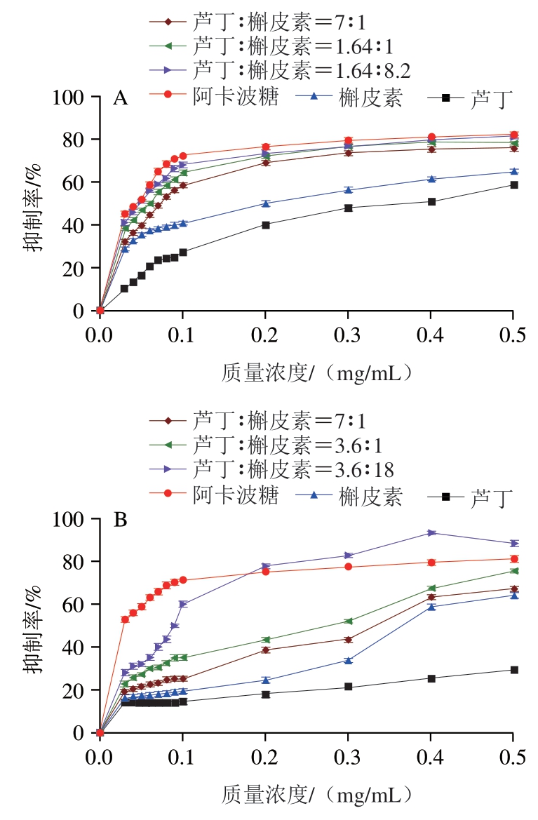 图7 芦丁和槲皮素联合使用对α-淀粉酶(A)和α-葡萄糖苷酶(B)的抑制能力
