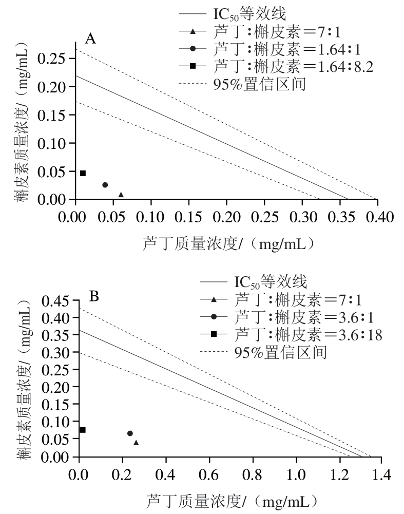 图8 芦丁和槲皮素联合抑制α-淀粉酶(A)和α-葡萄糖苷酶(B)的IC50等效线图