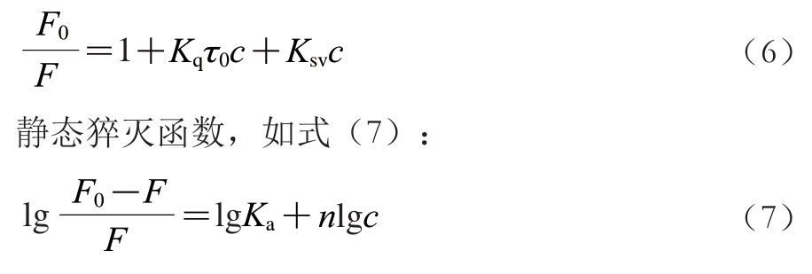 式(6)~(7)中:F0和F分别为α-淀粉酶和α-葡萄糖苷酶在不存在或存在芦丁和槲皮素时的荧光强度;c为芦丁和槲皮素的浓度;τ0为荧光团的平均荧光寿命;Kq、Ksv和Ka分别为猝灭速率常数、猝灭常数和结合常数;n为结合位点数。