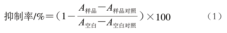 设置仅添加酶为空白组,抑制剂和酶都不添加为空白对照组,添加抑制剂和酶为样品组,仅添加抑制剂为样品对照组。以阿卡波糖作为阳性对照。按下式计算芦丁和槲皮素对α-淀粉酶和α-葡萄糖苷酶活性的抑制率: