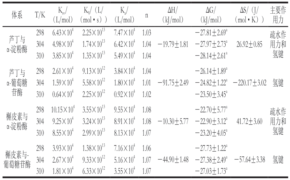 表1 芦丁或槲皮素与α-淀粉酶或α-葡萄糖苷酶相互作用及热力学参数