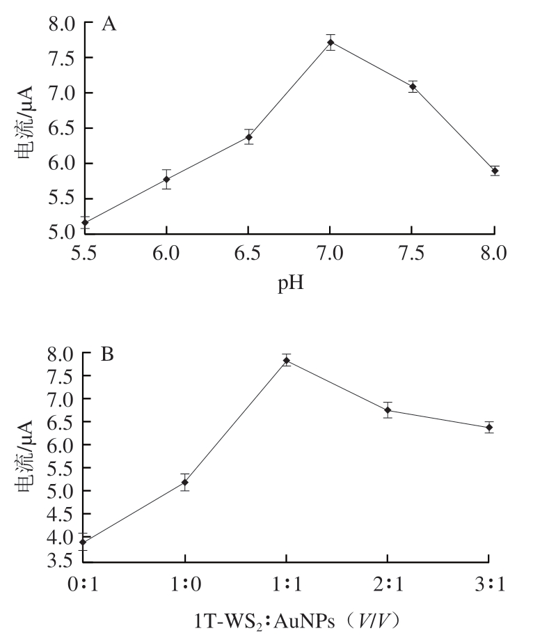 如图5A所示,随着pH值的增大,电流响应先增大后减小,在pH 7.0处具有最高电流响应。因此pH 7.0为最优pH值,后续实验使用pH 7.0的磷酸盐缓冲液。