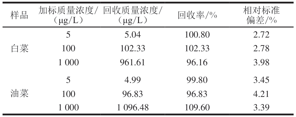 样品 加标质量浓度/(μg/L)回收质量浓度/(μg/L)回收率/%相对标准偏差/%5.04 100.80 2.72 100 102.33 102.33 2.78 1 000 961.61 96.16 3.98 5白菜4.99 99.80 3.45 100 96.83 96.83 4.21 1 000 1 096.48 109.60 3.39 5油菜