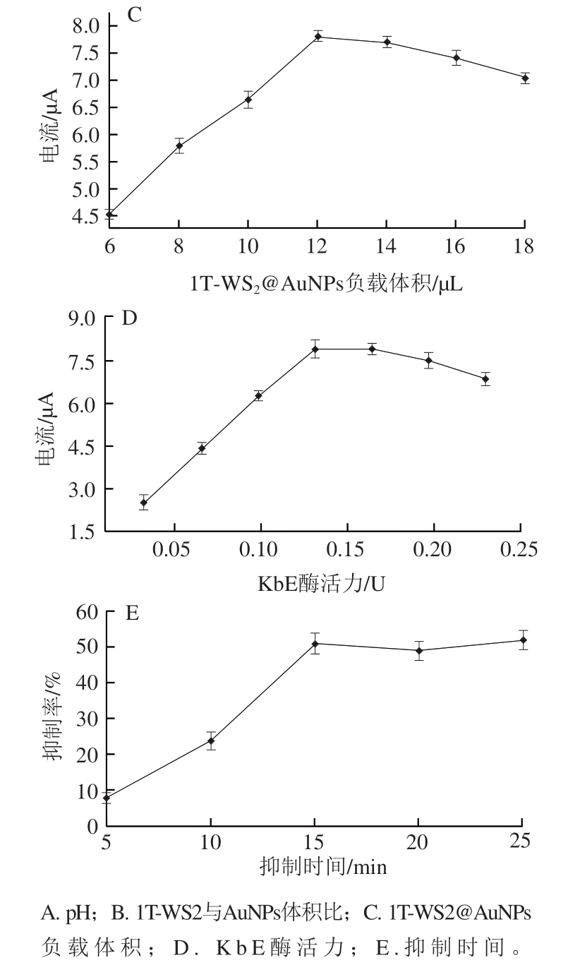采用SWV分别考察磷酸盐缓冲液pH值(5.5、6.0、6.5、7.0、7.5、8.0)、1T-WS2与AuNPs体积比(0∶1、1∶0、1∶1、2∶1、3∶1)、1T-WS2@AuNPs负载体积(6~18 μL)、KbE负载量(0.032~0.23 U)以及农药抑制时间(5~25 min)对响应电流的影响,优化电极制备参数。