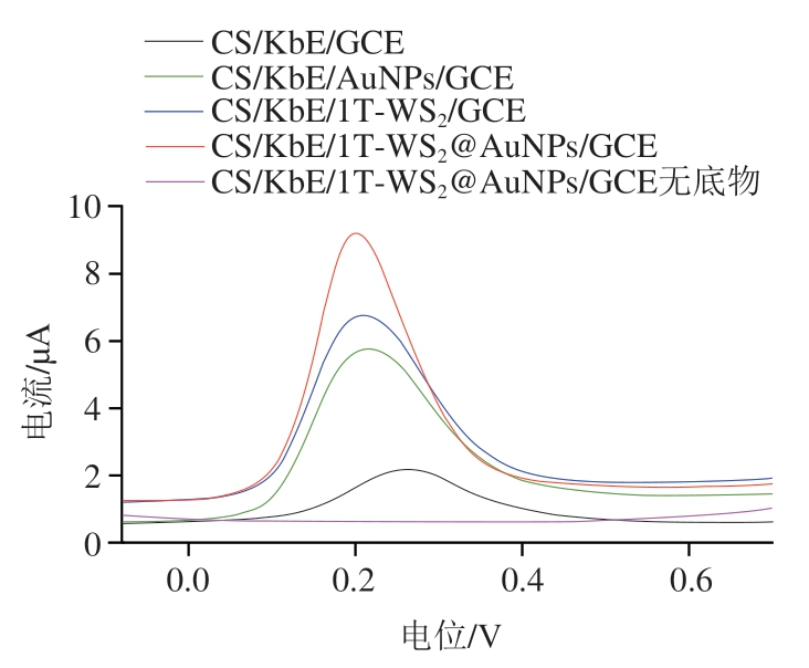 对玻碳电极(glassy carbon electrode,GCE)进行预处理,在含有Al2O3料浆的抛光绒布上打磨数次,依次在丙酮、无水乙醇和超纯水中进行超声清洗,活化后备用。采用滴涂法制备CS/KbE/1T-WS2@AuNPs/GCE修饰电极,在洁净的GCE表面滴涂一定体积的1T-WS2@AuNP纳米复合物分散液,在红外灯下烘干后,滴加一定体积的KbE,室温干燥后在其表面均匀覆盖一层质量分数为0.25%的CS,干燥后得到CS/KbE/1T-WS2@AuNPs/GCE修饰电极。其他修饰电极按照类似方法进行制备,所有酶电极于4 ℃贮存备用。