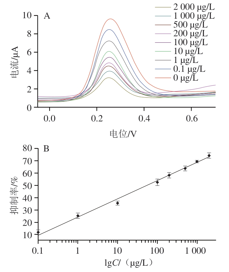 根据酶抑制率与杀螟硫磷质量浓度呈正比的线性关系,以峰电流值为纵坐标、杀螟硫磷质量浓度为横坐标构建标准曲线,其中杀螟硫磷质量浓度设置为0.1、1、10 100、200、500、1 000、2 000 μg/L。