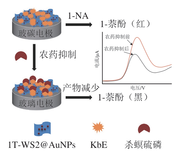 本研究构建来源于白芸豆的植物酯酶基电化学生物传感器,利用1T-WS2@AuNPs纳米复合材料优异的理化性能增敏传感信号,并对其农药检测性能和实际应用性能进行评价。杀螟硫磷检测原理如图1所示,芸豆酯酶(KbE)催化水解底物1-乙酸萘酯(1-naphthyl acetate,1-NA)产生电化学活性物质1-萘酚,当体系中存在农药杀螟硫磷时,KbE活性会被抑制,导致1-萘酚的产生减少,相应的电化学响应信号也会降低,从而实现杀螟硫磷的定量检测。