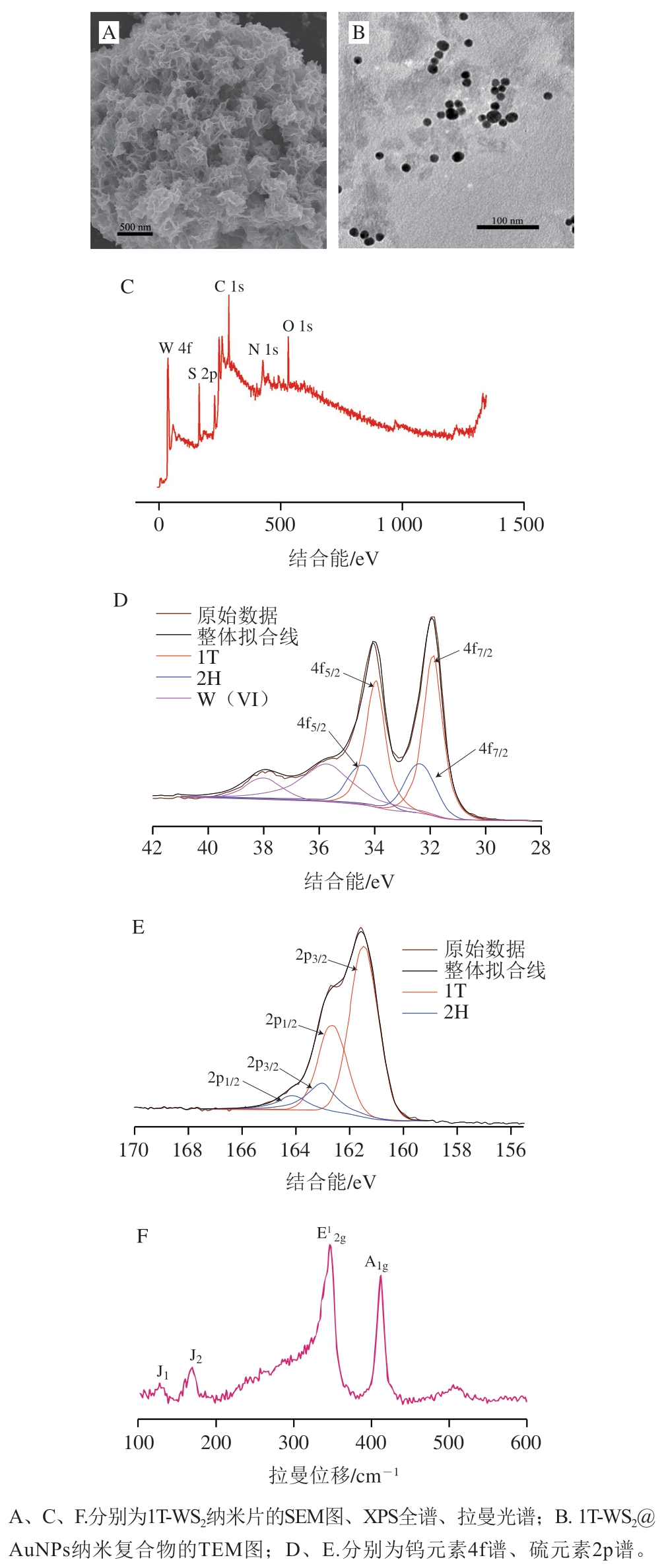 图2 1T-WS2及1T-WS2@AuNPs纳米材料的表征