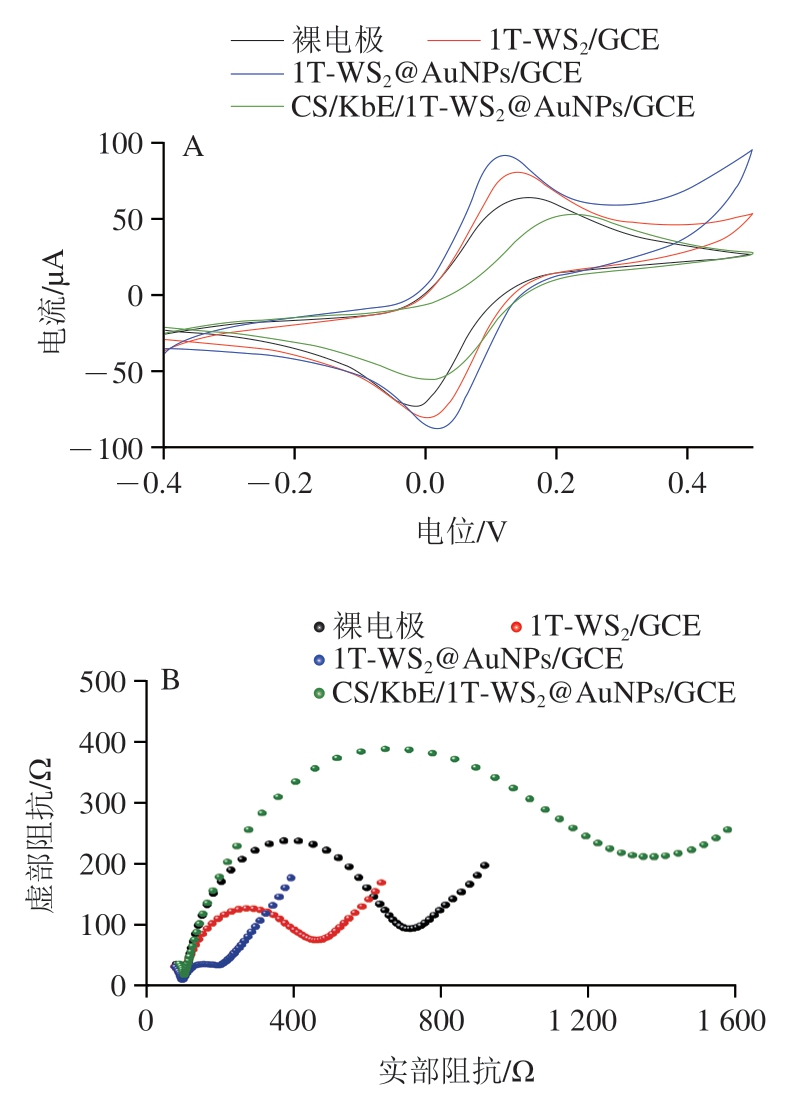 以GCE为工作电极,铂丝电极和Ag/AgCl电极分别为对电极和参比电极,在CHI660E电化学工作站上完成电化学测试。采用循环伏安法(cyclic voltammetry,CV)和电化学交流阻抗谱(electrochemical impedance spectroscopy,EIS)分别对经最优制备条件得到的裸电极(GCE)、1T-WS2/GCE、1T-WS2@AuNPs/GCE和CS/KbE/1T-WS2@AuNPs/GCE修饰电极进行测定,以表征传感器组装过程。5 mmol/L K3[Fe(CN)6]/K4[Fe(CN)6](1∶1,c/c)为电解质溶液,CV测试电压范围为-0.4~0.5 V,扫描速率100 mV/s;EIS测试采用相同的电解质溶液,频率范围为1~100 kHz,振幅5 mV。