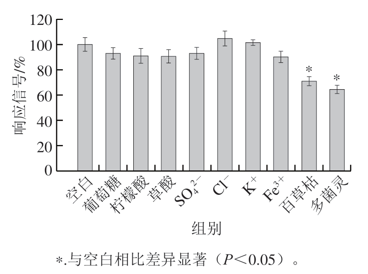 考察实际样品中可能共存的常见离子、有机物和其他类型农药对测定的影响。如图7所示,当存在5 mmol/L的葡萄糖、柠檬酸、草酸、Cl-、K+和Fe3+时,对SWV响应信号没有造成显著影响(P>0.05);但当存在50 μg/L的百草枯和多菌灵时,响应信号分别下降至70.96%和64.49%,可能是百草枯作为毒性较强的农药,对KbE有一定的抑制作用,而多菌灵是氨基甲酸酯农药的一种,对KbE也有抑制作用,这与文献中报道的一致[15,18]。结果表明,该CS/KbE/1T-WS2@AuNPs/GCE传感器具有良好的抗干扰能力。