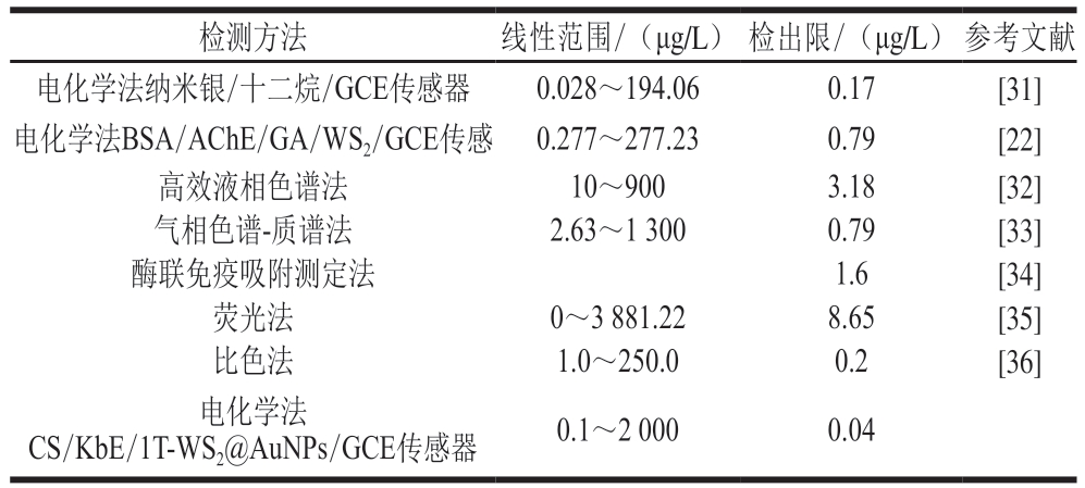 检测方法 线性范围/(μg/L) 检出限/(μg/L) 参考文献电化学法纳米银/十二烷/GCE传感器 0.028~194.06 0.17 [31]电化学法BSA/AChE/GA/WS2/GCE传感 0.277~277.23 0.79 [22]高效液相色谱法 10~900 3.18 [32]气相色谱-质谱法 2.63~1 300 0.79 [33]酶联免疫吸附测定法 1.6 [34]荧光法 0~3 881.22 8.65 [35]比色法 1.0~250.0 0.2 [36]电化学法CS/KbE/1T-WS2@AuNPs/GCE传感器 0.1~2 000 0.04