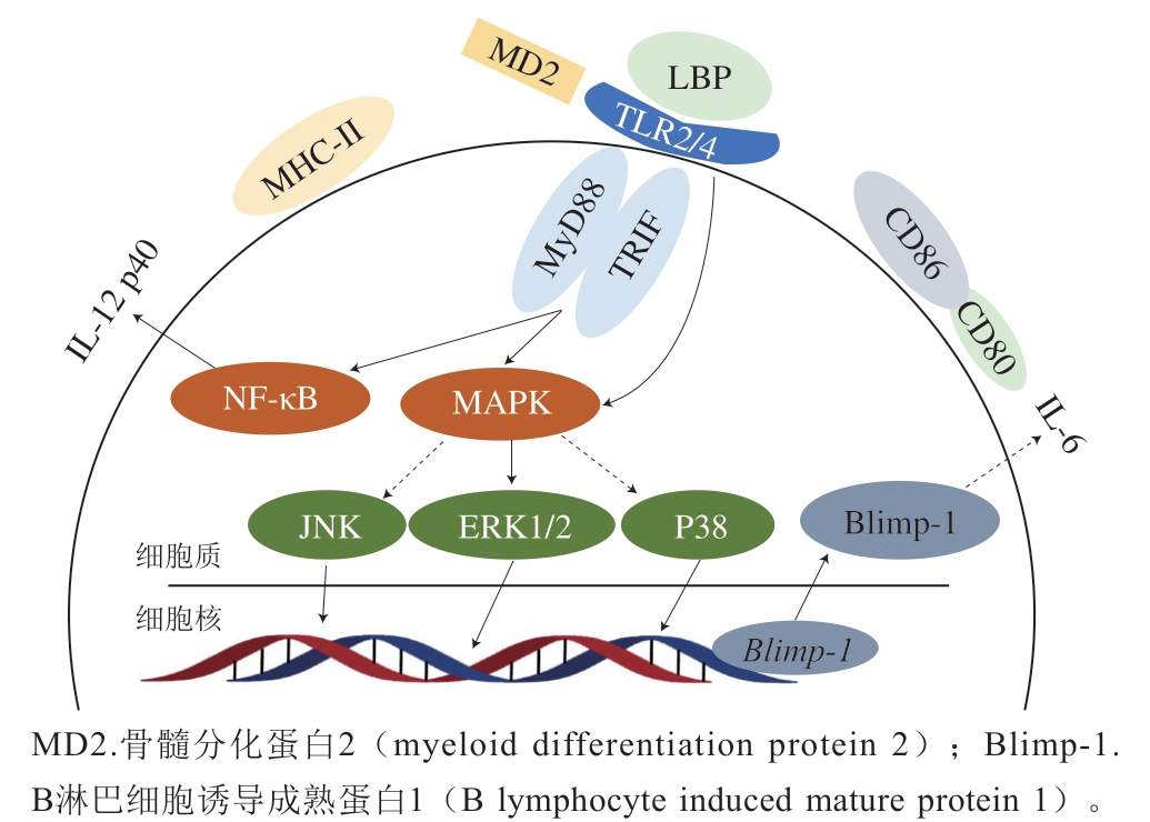 LBP对DC的影响可概括为4个方面:1)促进DC增殖;2)诱导DC表型和功能的成熟;3)刺激DC产生不同细胞因子,推动后续免疫反应;4)改变DC的吞噬效率。如郝习等[80]研究表明,LBP可促进DC的增殖;Zhu Jie等[81]研究表明,LBP(mw 31 kDa)可与DC表面的TLR2/4受体结合,继而激活NF-κB通路,诱导细胞产生炎性介质IL-12 p40(图4)。Duan Xiangguo等[82]发现LBP可通过TLR4-MAPK-Erk1/2-Blimp1通路刺激DC表型成熟,表现为细胞表面MHC-II、CD80和CD86表达量上升,炎性介质IL-6分泌量上升(图4)。此外,还有研究表明LBP可通过TLR2/4受体刺激p38 MAPK等通路,从而释放IL-6、IL-10、单核细胞趋化蛋白-1(monocyte chemotactic protein-1,MCP-1)、干扰素(interferon,IFN)-γ、TNF等细胞因子[83-84]。但也有研究表明,LBP既可以促进未成熟的DC吞噬抗原,也能适度抑制DC的成熟[85]。