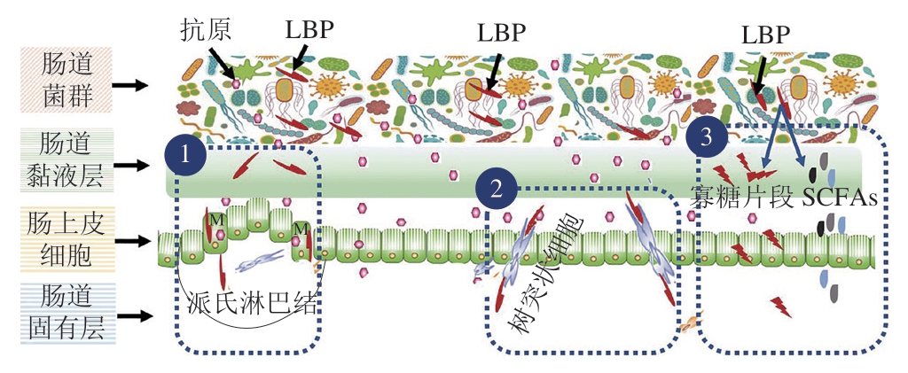 肠道菌群及其代谢产物可与机体免疫系统相互作用,因此能够对机体产生免疫调节作用[38]。某些高分子质量的LBP可作为能量物质被肠道菌群利用,由此改变菌群的结构、丰度和代谢产物,从而调控机体免疫状态。此外,由于不同菌群所表达的糖苷酶体系不同,LBP可对不同菌种产生促生长或抑制生长的不同影响[39]。王莹[9]利用水提醇沉提取、DEAE-52纤维素柱和HW-65色谱柱层析法纯化到了两个均一性的LBP组分(LBP1和LBP2),其分子质量分别为1 207.4 kDa和125 kDa。经体外模拟消化和Caco-2细胞模型转运实验发现,LBP1和LBP2均能耐受消化,且不易被小肠吸收。上述LBP1显著提高了双歧杆菌、乳杆菌、拟杆菌、普雷沃氏菌科和理研菌科的相对丰度,降低了大肠杆菌、副拟杆菌和瘤胃球菌的相对丰度[9]。有研究表明,当小鼠结肠中的双歧杆菌和乳杆菌丰度增加时,机体针对β-乳球蛋白的过度免疫反应得到了明显抑制[40]。