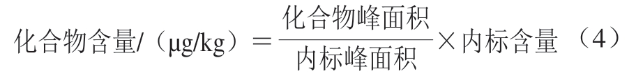 定量方式:参考Bonino等[24]使用2-辛醇作为内标物质,内标量44 μg/kg,结果根据每个化合物峰面积相对于内标物峰面积之比,按照内标物质浓度换算,按式(4)计算: