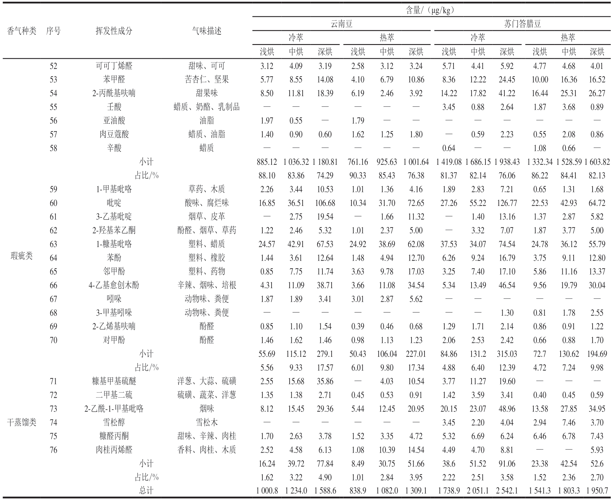 含量/(μg/kg)云南豆 苏门答腊豆冷萃 热萃 冷萃 热萃浅烘 中烘 深烘 浅烘 中烘 深烘 浅烘 中烘 深烘 浅烘 中烘 深烘52 可可丁烯醛 甜味、可可 3.12 4.09 3.19 2.58 3.12 3.24 5.71 4.41 5.92 4.77 4.68 4.01 53 苯甲醛 苦杏仁、坚果 5.77 8.55 14.08 4.10 6.79 10.86 8.36 12.22 24.45 10.00 16.36 16.52 54 2-丙酰基呋喃 甜果味 8.50 11.81 18.39 6.19 2.46 3.92 14.22 17.82 41.22 16.44 25.31 26.27 55 壬酸 蜡质、奶酪、乳制品 — — — — — — 3.45 0.88 2.64 1.87 3.68 0.89 56 亚油酸 油脂 1.970.55— 1.79— — — — — — — —57 肉豆蔻酸 蜡质、油脂 1.40 0.90 0.60 1.62 1.25 1.80 — 0.59 2.23 0.55 2.08 0.86 58 辛酸 蜡质 — — — — — — 0.64— — 1.080.66—小计 885.121 036.321 180.81 761.16 925.631 001.64 1 419.081 686.151 938.43 1 332.341 528.591 603.82占比/% 88.10 83.86 74.29 90.33 85.43 76.38 81.37 82.14 76.06 86.22 84.41 82.13香气种类 序号 挥发性成分 气味描述59 1-甲基吡咯 草药、木质 2.26 3.44 10.53 1.01 1.36 4.16 1.89 2.83 7.21 0.65 1.31 1.68 60 吡啶 酸味、腐烂味 16.85 36.51 106.68 10.34 31.70 72.65 27.26 55.22 126.77 22.53 42.93 64.72 61 3-乙基吡啶 烟草、皮革 — 2.75 19.54 — 1.66 11.32 — 1.40 13.16 1.37 2.87 5.82 62 2-羟基苯乙酮 酚醛、烟草、草药 1.22 2.46 5.32 1.01 2.37 5.00 — 3.32 7.07 1.87 3.77 5.00 63 1-糠基吡咯 塑料、蜡质 24.57 42.91 67.53 24.92 38.69 62.08 37.53 34.07 74.54 24.78 36.12 55.79 64 苯酚 塑料、橡胶 1.44 3.61 12.64 1.48 4.94 12.70 6.26 9.24 16.79 3.75 9.11 12.80 65 邻甲酚 塑料、药物 0.85 7.75 11.74 3.63 9.78 17.03 3.25 7.40 17.10 5.86 11.16 13.37 66 4-乙基愈创木酚 辛辣、烟味、培根 4.31 11.09 38.71 3.66 11.08 34.54 5.34 13.49 46.54 9.56 19.79 30.04 67 吲哚 动物味、粪便 1.87 1.89 3.41 3.01 2.87 5.62 — — — — — —68 3-甲基吲哚 动物味、粪便 — — — — — — — — 1.30 0.81 1.78 2.55 69 2-乙烯基呋喃 酚醛 0.85 1.10 1.54 0.39 0.46 0.68 1.29 1.71 2.14 0.86 0.91 1.22 70 对甲酚 酚醛 1.46 1.62 1.46 0.98 1.13 1.23 2.06 2.53 2.42 0.66 0.88 1.70小计 55.69 115.12 279.1 50.43 106.04 227.01 84.86 131.2 315.03 72.7 130.62 194.69占比/% 5.56 9.33 17.57 6.01 9.80 17.34 4.88 6.40 12.39 4.72 7.24 9.98 71 糠基甲基硫醚 洋葱、大蒜、硫磺 2.55 15.68 35.86 — 4.03 10.54 3.77 11.27 19.60 — — —72 二甲基二硫 硫磺、蔬菜、洋葱 1.35 1.38 2.71 0.45 0.53 0.91 1.42 3.59 3.41 0.40 0.45 0.59 73 2-乙酰-1-甲基吡咯 烟味 8.12 15.45 29.36 5.44 12.45 20.95 20.15 23.07 48.96 13.58 27.85 34.95干蒸馏类 74 雪松醇 雪松木 — — — — — — 3.45 2.20 4.04 2.94 7.46 3.70 75 糠醛丙酮 甜味、辛辣、肉桂 1.70 2.63 3.78 1.52 3.35 4.72 5.32 6.69 6.24 6.46 6.78 7.43 76 肉桂丙烯醛 香料、肉桂、木质 2.52 4.58 6.13 1.08 10.39 14.54 4.49 4.70 8.81 — — 5.93小计 16.24 39.72 77.84 8.49 30.75 51.66 38.6 51.52 91.06 23.38 42.54 52.6占比/% 1.62 3.22 4.90 1.01 2.84 3.95 2.22 2.51 3.58 1.52 2.36 2.70总计 1 000.8 1 234.0 1 588.6 838.9 1 082.0 1 309.1 1 738.9 2 051.1 2 542.1 1 541.3 1 803.31 950.7瑕疵类