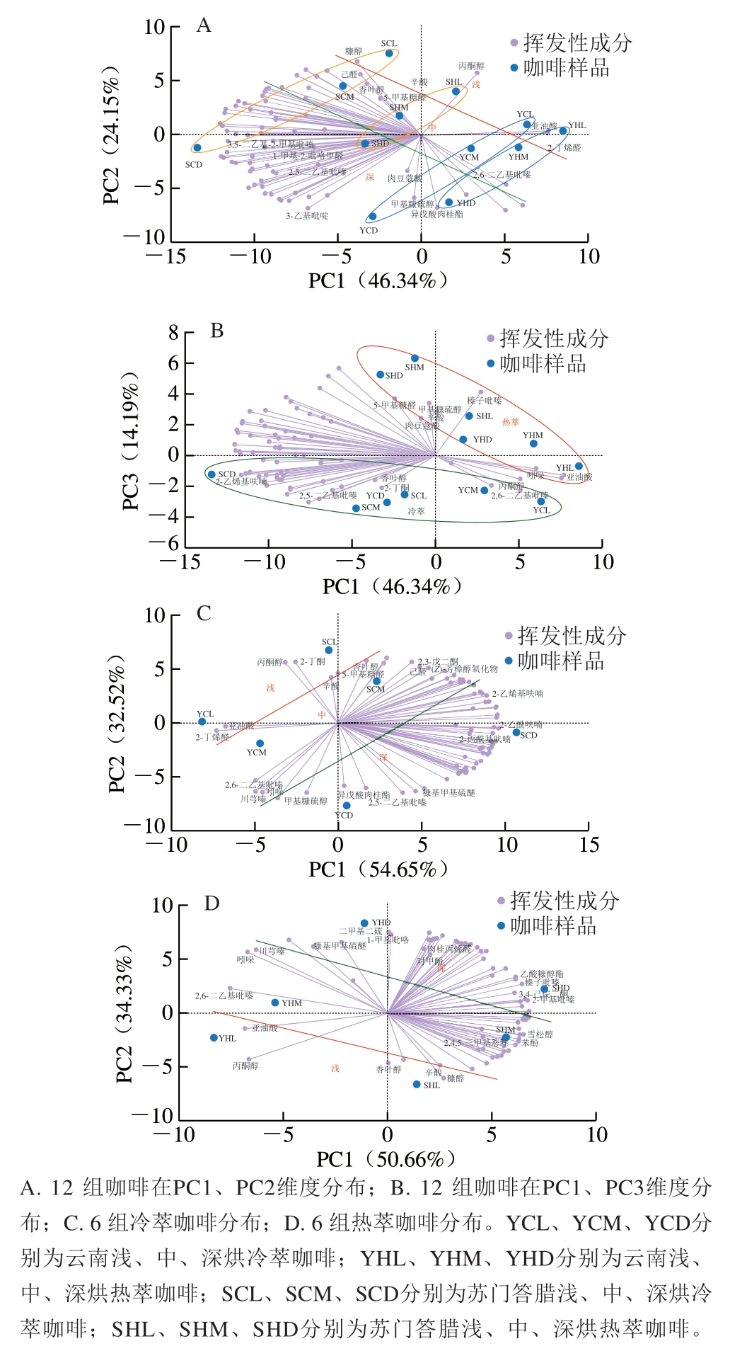 此外,对冷萃咖啡样品和热萃咖啡样品分别进行PCA(图3C、D),从而分析不同烘焙度的咖啡豆在冷萃与热萃萃取液中挥发性成分影响的差异。由图3C可知,6 组冷萃咖啡样品在PC1和PC2维度上有明显区分,PC1和PC2的贡献度分别为54.65%和32.52%。浅烘冷萃咖啡(红线以上)主要分布于第2象限附近,中烘冷萃咖啡(红、绿线中间)主要分布于原点两侧,深烘冷萃咖啡(绿线以下)主要分布于第4象限附近,挥发性成分主要分布于PC1正半轴,表明不同烘焙度的冷萃咖啡的挥发性物质贡献率具有明显差异。与浅烘冷萃咖啡分布较近的主要挥发性成分有2-丁酮、香叶醇、辛酸(苏门答腊豆)和2-丁烯醛、亚油酸(云南豆);与中烘冷萃咖啡分布较近的主要挥发性成分有2,3-戊二酮、己醛、(Z)-芳樟醇氧化物(苏门答腊豆)和2,6-二乙基吡嗪、川芎嗪、吲哚(云南豆);与深烘冷萃咖啡分布较近的主要挥发性成分有2-乙烯基呋喃、2-乙酰呋喃、2-丙酰基呋喃(苏门答腊豆)和甲基糠硫醇、2,5-二乙基吡嗪、糠基甲基硫醚、异戊酸肉桂酯(云南豆)。由图3D可知,6 组热萃咖啡样品在PC1和PC2维度上有明显区分,PC1和PC2的贡献度分别为50.66%和34.33%。浅烘热萃咖啡(红线以下)主要分布于第3象限附近,中烘热萃咖啡(红、绿线中间)主要分布于原点两侧,深烘热萃咖啡(绿线以上)主要分布于第2象限附近,挥发性成分主要分布于PC1正半轴。与浅烘热萃咖啡分布较近的主要挥发性成分有香叶醇、糠醇、辛酸(苏门答腊豆)和丙酮醇、亚油酸(云南豆);与中烘热萃咖啡分布较近的主要挥发性成分有2,4,5-三甲基恶唑、2,3-戊二酮、苯酚(苏门答腊豆)和2,6-二乙基吡嗪、川芎嗪、吲哚(云南豆);与深烘热萃咖啡分布较近的主要挥发性成分有榛子吡嗪、乙酸糠醇酯、3,4-己烷二酮、2-甲基吡嗪(苏门答腊豆)和二甲基二硫、对甲酚、1-甲基吡咯、肉桂丙烯醛(云南豆)。