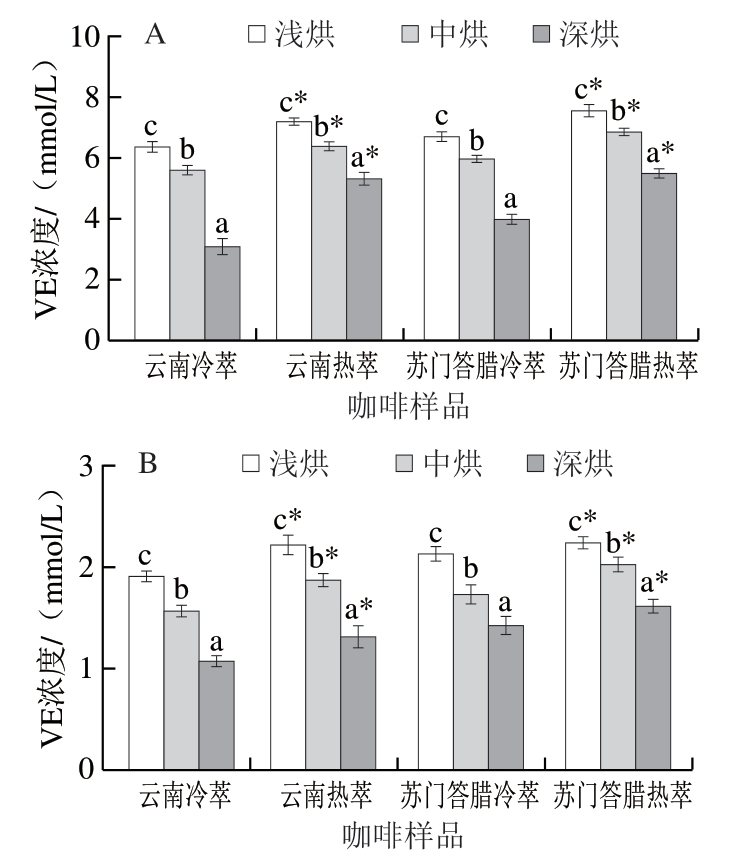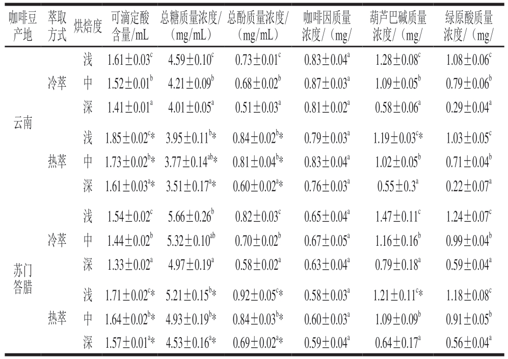 咖啡豆产地萃取方式 烘焙度 可滴定酸含量/mL总糖质量浓度/(mg/mL)总酚质量浓度/(mg/mL)咖啡因质量浓度/(mg/葫芦巴碱质量浓度/(mg/绿原酸质量浓度/(mg/冷萃浅 1.61±0.03c 4.59±0.10c 0.73±0.01c 0.83±0.04a 1.28±0.08c 1.08±0.06c中 1.52±0.01b 4.21±0.09b 0.68±0.02b 0.87±0.03a 1.09±0.05b 0.79±0.06b深 1.41±0.01a 4.01±0.05a 0.51±0.03a 0.81±0.02a 0.58±0.06a 0.29±0.04a云南热萃浅 1.85±0.02c* 3.95±0.11b* 0.84±0.02b* 0.79±0.03a 1.19±0.03c* 1.03±0.05c中 1.73±0.02b*3.77±0.14ab* 0.81±0.04b* 0.83±0.04a 1.02±0.05b 0.71±0.04b深 1.61±0.03a* 3.51±0.17a* 0.60±0.02a* 0.76±0.03a 0.55±0.3a 0.22±0.07a冷萃苏门答腊浅 1.54±0.02c 5.66±0.26b 0.82±0.03c 0.65±0.04a 1.47±0.11c 1.24±0.07c中 1.44±0.02b 5.32±0.10ab 0.70±0.02b 0.67±0.05a 1.16±0.16b 0.99±0.04b深 1.33±0.02a 4.97±0.19a 0.58±0.02a 0.63±0.04a 0.79±0.18a 0.59±0.04a热萃浅 1.71±0.02c* 5.21±0.15b* 0.92±0.05c* 0.58±0.03a 1.21±0.11c* 1.18±0.08c中 1.64±0.02b* 4.93±0.19b* 0.84±0.03b* 0.60±0.03a 1.09±0.09b 0.91±0.05b深 1.57±0.01a* 4.53±0.16a* 0.69±0.02a* 0.59±0.04a 0.64±0.17a 0.56±0.04a