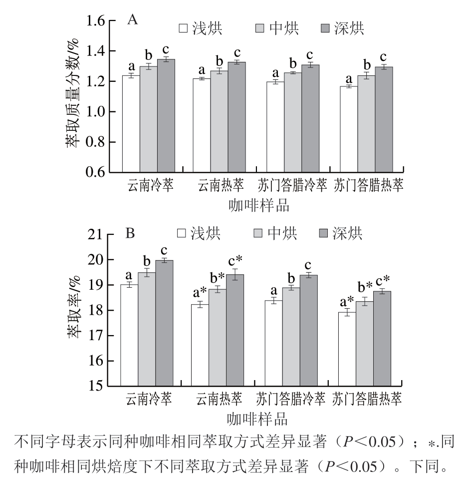 图1 不同烘焙度冷萃和热萃亚洲咖啡萃取质量分数(A)和萃取率(B)