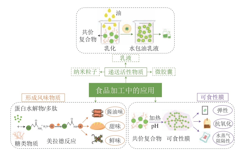 食源蛋白水解物/多肽与糖类物质美拉德反应产物在食品工业中的应用如图6所示,主要包括:1)促进食品色泽、风味物质的形成;2)保护生物活性物质的递送;3)制备可食性膜等。