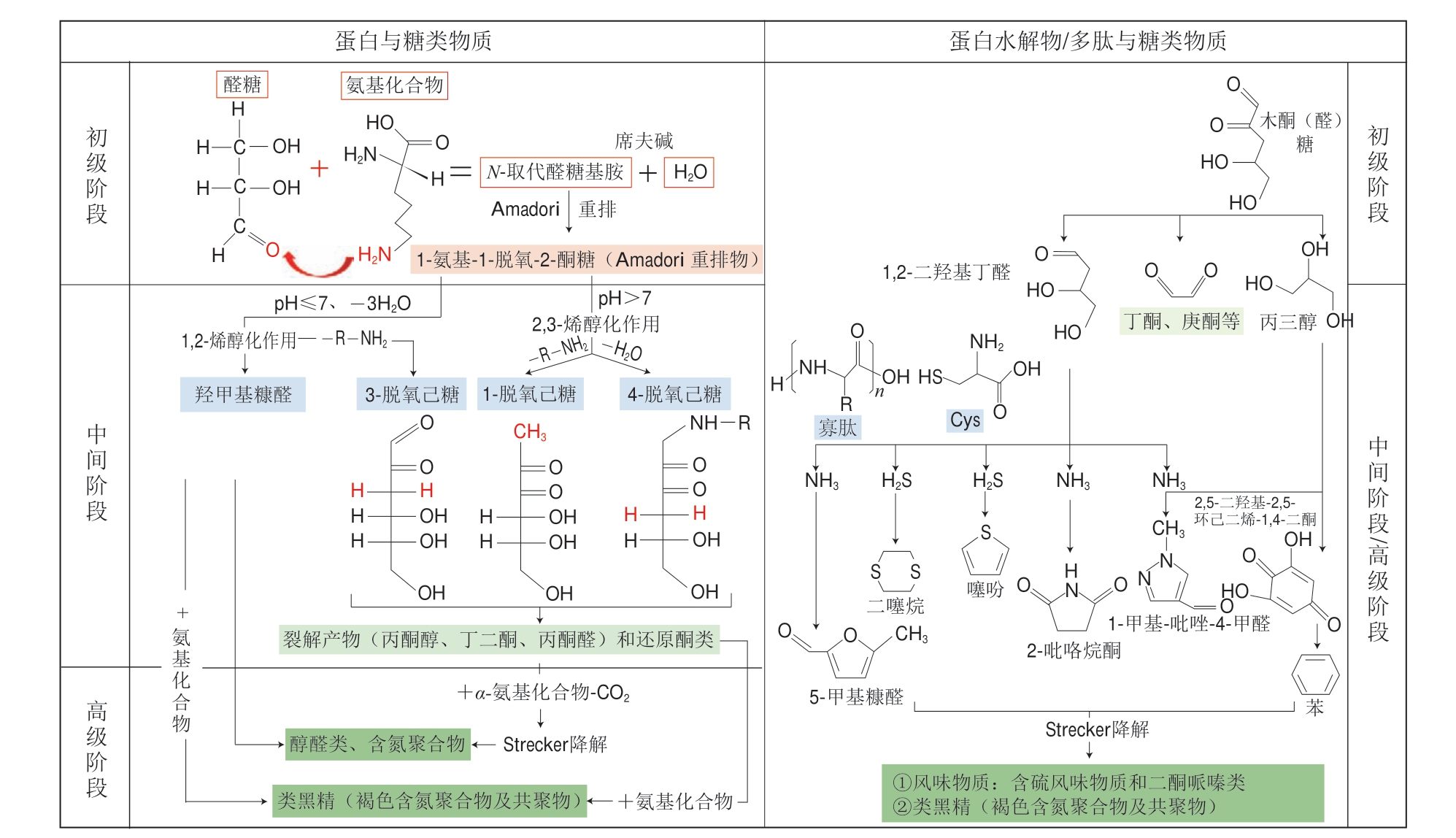 初级阶段:风味前体物质形成。该阶段主要包括羰氨缩合和分子重排反应。如蛋白水解度较低其反应机制与蛋白类似。若体系中有醛糖存在,则经Amadori重排生成中间体1-氨基-1-脱氧-2-酮糖;若有酮糖存在,则经Heyns重排形成中间体2-氨基-2-脱氧-1-醛糖。若在酸性条件下,重排产物会失去氨基酸或氨基形成3-脱氧糖酮的中间体;若在中性、弱碱性条件下形成1-脱氧糖酮中间体,在反应体系中中间体属于不挥发性香味物质的前体成分,但不会对食品色泽和香味的变化产生影响。如蛋白水解物/多肽分子质量较小,会发生寡肽的断裂、聚合再与糖类物质发生Amadori重排,但反应速率较快。