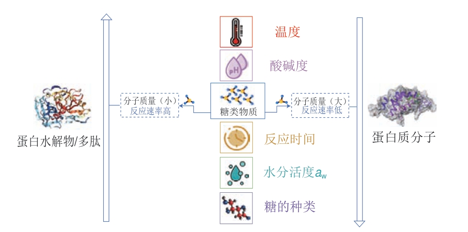 图4 蛋白、蛋白水解物/多肽与糖类物质发生美拉德反应的影响因素