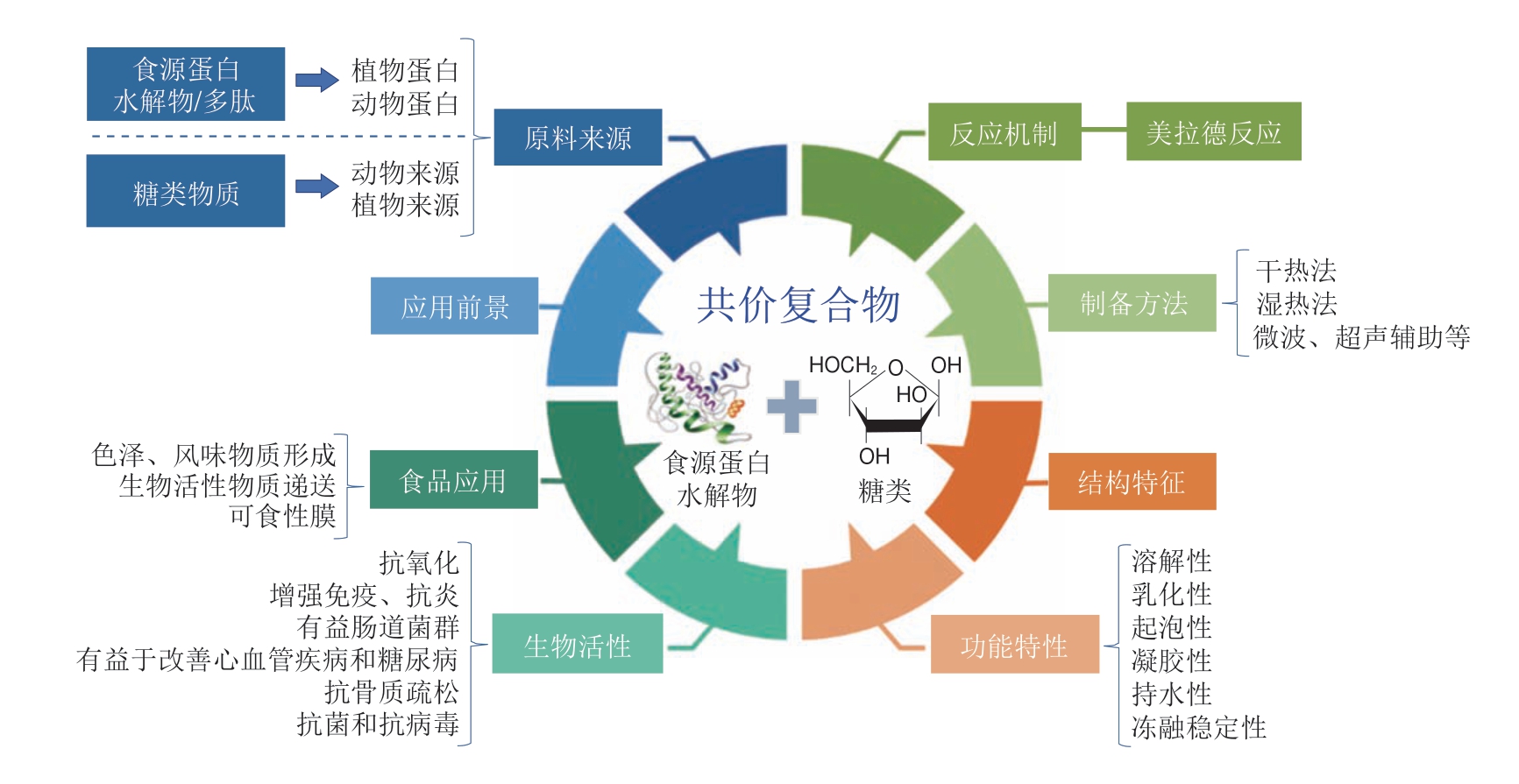 蛋白水解物/多肽和糖类物质是食品功能原料两类重要的食源性生物大分子,具有来源丰富、营养价值高、开发潜力大的优势。近年来,基于食源蛋白水解物/多肽和糖类物质之间通过共价或非共价作用形成的复合物,因其分子结构特殊、营养功能突出和生物相容性好等特点对食品的加工品质、功能特性和营养健康功效具有重要影响;同时Tamura等[1]的报道揭示了蛋白多肽-糖类复合物与营养健康之间具有关联性,对改善机体功能具有重要作用,因此,相关研究在食品领域备受关注。