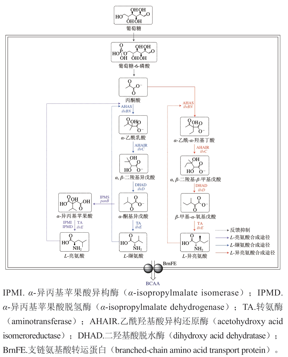 支链氨基酸(branched chain amino acid,BCAA)即L-缬氨酸、L-亮氨酸、L-异亮氨酸,参与动物和人类的蛋白质合成并广泛应用于食品、药品和动物饲料行业[1-4]。目前,用于BCAA生产的方法包括化学合成法、蛋白质水解法以及微生物发酵法[5-7]。而化学合成法以及蛋白质水解法存在合成过程操作复杂、副产物多、产率低等问题[8]。微生物发酵法由于其成本低、产量高、不需要金属催化剂、作用条件温和等优点而备受关注[9]。如今,通过代谢工程与合成生物学在微生物中的应用,改造代谢网络从而改变代谢流的方向控制产物的合成成为研究热点[10]。