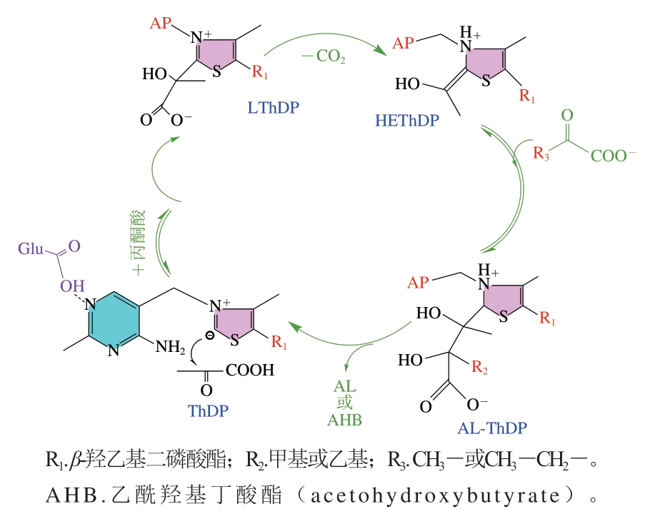 Jana等[28]发现叶立德中间体具有亲核性质,亲核叶立德辅助C2原子对丙酮酸分子的Cα原子进行亲核攻击,从而形成乳酰-ThDP中间体(lactyl-ThDP,L-ThDP)。L-ThDP脱羧形成羟乙基-ThDP阴离子/烯胺中间体(hydroxyethyl-ThDP,HEThDP)。随后,2-酮酸底物(丙酮酸和2-KB)与该中间体反应形成复合物乙酰乳酸(acetolactate,AL)-ThDP。最后产物被释放,再次形成ThDP(图5)。