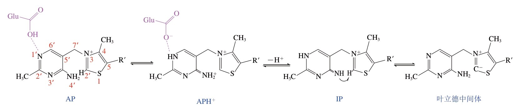 ThDP作为AHAS催化机制中必不可少的物质,是可以辅助催化糖代谢中碳碳键形成和断键反应的辅助因子。它由1 个4’氨基嘧啶环(4’-aminopyrimidine,AP)和1 个由亚甲基桥接的噻唑环组成[27-28]。两个芳香环都参与催化,其中噻唑环作为亲电共价催化剂,AP作为酸碱催化剂[29]。AHAS由1 个高度保守的谷氨酸残基激活,该残基使AP互变异构体的嘧啶环中1’-氮原子质子化,从而形成APH+。由于互变异构形式的1’,4’-亚氨基嘧啶(1’,4’-iminopyrimidine,IP)中ThDP的反应性结构(V构象),高度碱性的4’-亚氨基基团非常靠近第2位碳原子(催化中心)并产生叶立德中间体(图4)。