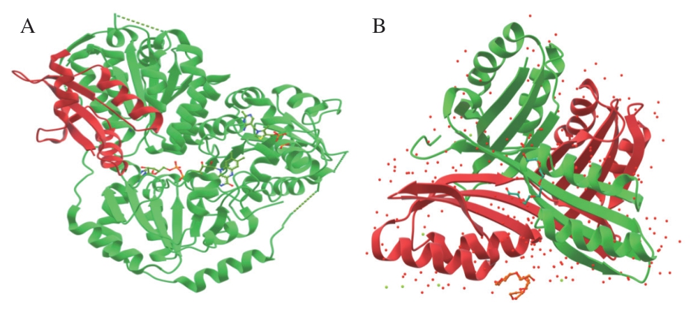 Fig. 2 Structure of E. coli AHAS I holoenzyme (A)[19] and regulatory subunit structure of E. coli AHAS III (B)[21]
