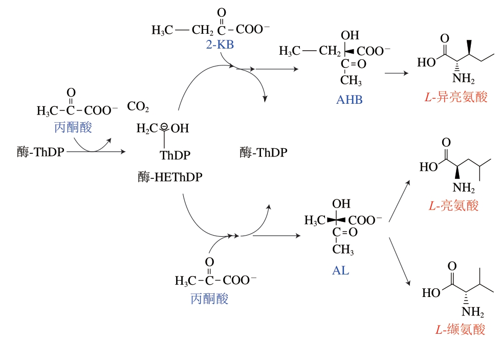 AHAS催化丙酮酸的脱羧以及双碳中间体HEThDP-与2-KB的特异性缩合,形成AL或AHB[37]。它们是生物合成途径中通向合成BCAA的中间产物。如图6所示,AHAS在L-缬氨酸和L-亮氨酸的形成途径中催化两分子丙酮酸缩合形成AL,在L-异亮氨酸形成途径中催化丙酮酸和2-KB缩合形成AHB[12]。因为2-酮丁酸盐和丙酮酸盐之间的竞争决定了L-异亮氨酸和L-缬氨酸、L-亮氨酸形成的相对速率。大多数AHAS对酮丁酸盐比对丙酮酸盐更有亲和力[38],因此该酶在确定不同最终产物的相对通量方面发挥关键性作用。据报道,大肠杆菌AHAS I的两个氨基酸残基Gln480和Met476分别取代了其他AHAS中保守的Trp和Leu残基[39]。这种差异导致产物AHB的释放速度比AL快得多,并且该酶对2-KB没有底物特异性。Ibdah等[40]在大肠杆菌的AHAS II活性位点中鉴定出残基,这些残基会影响反应中产物关键步骤的速率,并且Trp464的突变会导致对2-KB偏好性的丧失。Tittmann等[41]在大肠杆菌AHAS II中观察到AHB比AL的形成更稳定,释放速率高出两倍以上,并提出该酶对2-KB的偏好性可能归因于这一性质。Sánchez等[42]结合量子力学、分子动力学分析发现,中间体HEThDP-与2-KB的反应分为两个步骤。第一步反应中,碳负离子对2-KB进行亲核攻击,HEThDP-的羟基向2-KB的羰基氧转移质子,并且碳化反应优先于质子转移;在第二步中叶立德中间体的再生伴随着产物的释放,进而再一次启动催化循环。Engel等[43]发现大肠杆菌的AHAS II中的Arg残基在2-KB特异性反应起到关键性作用,并发现该残基的诱变体Arg276在反应的第二阶段成为速率决定性因素。随着研究人员对AHAS在产物形成中作用研究的深入,发现该酶在不同的BCAA合成途径中是有差异的。这种对丙酮酸与2-KB结合的差异性为日后对该酶的分子改造提供了研究基础。未来,鉴定更多不同物种的AHAS中对产物连接速率起作用的残基并加以改造可能会对BCAA的产量有所影响。