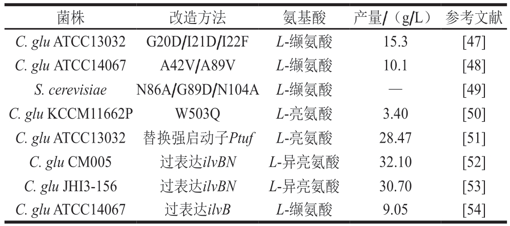 菌株改造方法氨基酸 产量/(g/L)参考文献C. glu ATCC13032G20D/I21D/I22FL-缬氨酸15.3[47]C. glu ATCC14067A42V/A89VL-缬氨酸10.1[48]S. cerevisiaeN86A/G89D/N104A L-缬氨酸—[49]C. glu KCCM11662PW503Q L-亮氨酸3.40[50]C. glu ATCC13032替换强启动子PtufL-亮氨酸28.47[51]C. glu CM005过表达ilvBNL-异亮氨酸 32.10[52]C. glu JHI3-156过表达ilvBNL-异亮氨酸30.70[53]C. glu ATCC14067过表达ilvBL-缬氨酸9.05[54]