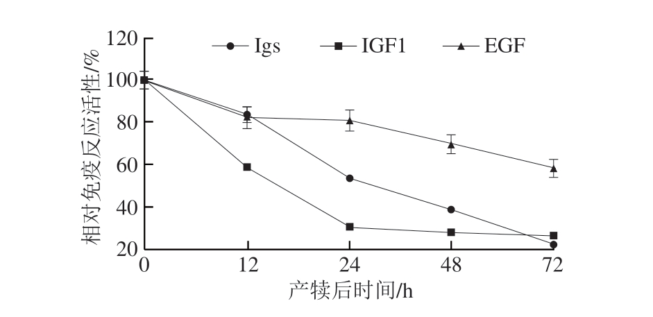 牛初乳的营养素种类和含量与成熟乳相比存在较大差异,其酪蛋白、乳清蛋白(Igs、乳铁蛋白等)、脂肪、维生素、矿物质、生长因子等含量较高,特别是IgG和乳铁蛋白含量远远高于成熟乳,分别约为成熟乳的75~280 倍和2~250 倍[6],而乳糖含量相对较低(表1)。除乳糖外,牛初乳中的其他营养素均在产犊后前3 d逐渐下降,特别是乳清蛋白含量下降最快,产犊3 d后的乳中乳清蛋白含量接近成熟乳[1](图1);此外,如图2所示,牛初乳中Igs、表皮生长因子(epidermal growth factor,EGF)和胰岛素样生长因子1(insulin-like growth factor,IGF1)等活性成分的含量也在产犊后3 d内逐渐下降[6-7]。牛初乳中大多数维生素含量通常高于成熟乳,尤其是VB2、VB12、VE和VD;牛初乳的必需矿物质如钙、磷、镁、锌含量也高于成熟乳。此外,牛初乳的其他活性成分如乳脂肪球膜也随着泌乳期的延长而发生改变。这些营养素组成和含量的不同使牛初乳较成熟乳具有更多的生物学功能。