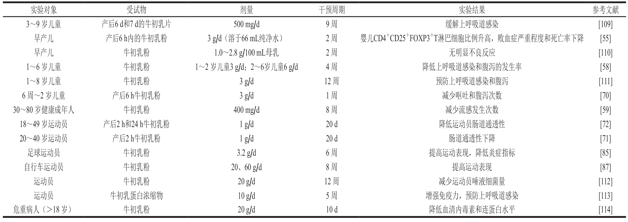 表2 牛初乳临床试验