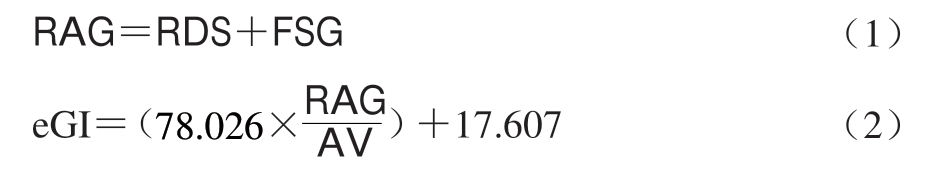 研究发现,以淀粉为主的碳水化合物食品中的RDS及快速可利用葡萄糖(rapidly available glucose,RAG)的含量均与GI值呈极显著的正相关关系(P<0.001)[32-33]。因此,一般情况下可根据待测食品中RDS、RAG以及可利用碳水化合物的含量来快速预估待测食品的GI值(expected glycemic index,eGI)(式(1)、(2))[33-34],这一结论随即得到了Garsetti等[35]的验证。Ren Xin等对谷物与纯谷物食品进行体外模拟消化后也发现,待测食品中RDS的含量与其eGI值具有显著的相关性(r=0.988)[36]。此外,Ek等[37]也发现,煮熟的马铃薯在120 min时的水解百分比可作为GI分类的重要指标;Araya等[38]报道指出,混合早餐中碳水化合物的快/慢消化率间的比值与GI显著相关。