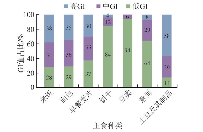 Atkinson等[11]统计并收录了几千种食品的平均GI和GL值,并每隔几年进行一次更新。在其最近发表的论文中,其同时考虑了相同食物在不同食用条件下GI值的差异性,并统计了同一种食物为高、中、低GI值的概率。图3主要列举了我国居民常见主食GI值分别为高、中和低的概率分布。例如,豆类食品有94%的概率为低GI食品,而土豆及其制品为低GI食品的概率仅为14%。此外,虽然一般认为米饭的GI值较高,但结果显示,仍然有34%的米饭为中等GI值,有28%的概率为低GI值(GI<55)。