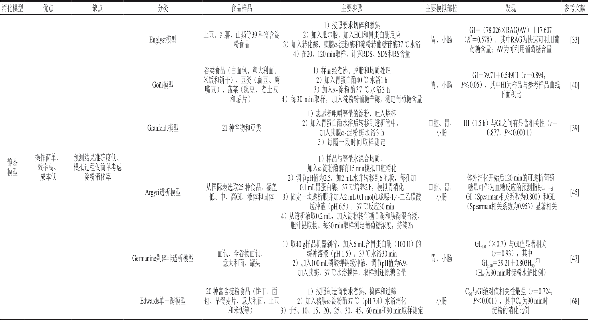 消化模型优点缺点分类食品样品主要步骤主要模拟部位发现参考文献Englyst模型土豆、红薯、山药等39 种富含淀粉食品1)按照要求切碎和煮熟2)加入瓜尔胶,加入HCl和胃蛋白酶反应3)加入转化酶、胰腺α-淀粉酶和淀粉转葡糖苷酶37 ℃水浴4)在20、120 min取样,计算RDS、SDS和RS含量胃、小肠GI=(78.026×RAG/AV)+17.607(R2=0.578),其中RAG为快速可利用葡萄糖含量;AV为可利用葡萄糖含量[33]Goñi模型谷类食品(白面包、意大利面、米饭和饼干)、豆类(扁豆、鹰嘴豆)、蔬菜(豌豆、煮土豆和薯片)1)样品经煮沸、脱脂和均质处理2)加入胃蛋白酶40 ℃ 水浴1 h 3)加入α-淀粉酶37 ℃水浴3 h 4)每30 min取样,加入淀粉转葡糖苷酶,测定葡萄糖含量胃、小肠GI=39.71+0.549HI(r=0.894,P≤0.05),其中HI为样品与参考样品曲线下面积比[40]Granfeldt模型21 种谷物和豆类1)志愿者咀嚼等量的淀粉,吐入烧杯2)加入胃蛋白酶水浴后转移到透析管中,加入胰腺α-淀粉酶水浴3 h 3)每隔一段时间取样测定口腔、胃、小肠HI(1.5 h)与GI之间有显著相关性(r=0.877,P<0.000 1)[39]静态模型操作简单、效率高、成本低预测结果准确度低、模拟过程仅简单考虑淀粉消化率Argyri透析模型从国际表选取25 种食品,涵盖低、中、高GI,液体和固体1)样品与等量水混合均质,加入α-淀粉酶孵育15 min模拟口腔消化2)调节pH值为2.5,加2 mL水并转移到6 孔板,每孔加0.1 mL胃蛋白酶,37 ℃培养2 h,模拟胃消化3)固定一块透析膜并加入2 mL 0.1 mol/L哌嗪-1,4-二乙磺酸缓冲液(pH 6.5),37 ℃反应30 min 4)从透析液取0.2 mL,加入淀粉转葡糖苷酶和胰酶混合液、胆汁提取物。每30 min取样测定葡萄糖浓度,持续2h口腔、胃、小肠体外消化开始后120 min的可透析葡萄糖量可作为血糖反应的预测指标。与GI(Spearman相关系数为0.800)和GL(Spearman相关系数为0.953)显著相关[45]Germanine剁碎非透析模型面包、全谷物面包、意大利面、罐头1)取40 g样品机器剁碎,加入6 mL含胃蛋白酶(100 U)的缓冲溶液(pH 1.5),37 ℃水浴30 min 2)加入100 mL磷酸钾钠缓冲液,调节pH值为6.9,加入胰酶,37 ℃水浴搅拌,取样测还原糖含量胃、小肠GIH90(×0.7)与GI值显著相关(r=0.93),其中GIH90=39.21+0.803H90[67](H90为90 min时淀粉水解比例)[43]Edwards单一酶模型20 种富含淀粉食品(饼干、面包、早餐麦片、意大利面、土豆和米饭等)1)按照制造商要求煮熟、捣碎和过筛2)加入猪胰α-淀粉酶37 ℃(pH 7.4)水浴消化3)于5、10、15、20、25、30、45、60 min和90 min取样测定小肠C90与GI绝对值相关性最强(r=0.724,P<0.001),其中C90为90 min时淀粉的消化比例[68]
