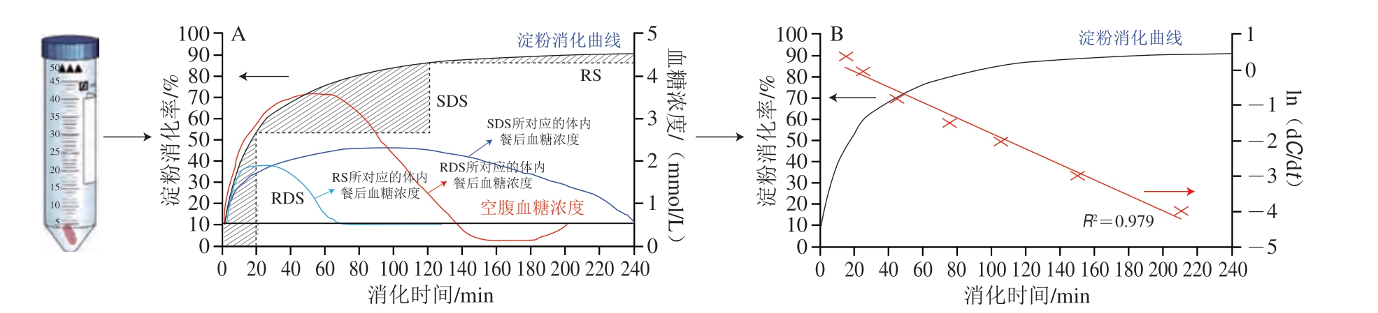 如图1A所示,Englyst等[27]根据不同时间段内食品中淀粉消化的程度,将其分为快消化淀粉(rapidly digestible starch,RDS)(可在0~20 min内消化)、慢消化淀粉(slowly digestible starch,SDS)(可在20~120 min内消化)以及抗性淀粉(resistant starch,RS)(120 min内未消化)。其中,RDS的摄入能够迅速提高餐后血糖水平,为人体活动提供必要的能量[28]。研究发现,RDS含量较高的食物可导致餐后血糖浓度快速升高,长期食用会诱发与饮食相关的代谢性慢性疾病(如2型糖尿病)[29],而SDS含量较高的食物由于消化较为平缓,餐后血糖浓度较为稳定,更有利于健康[30]。与RDS和SDS相比,一般认为,食品中的RS难以甚至不会在人体上消化道消化。相反地,RS最终经结肠中的微生物群发酵利用后释放的短链脂肪酸等物质还有利于调节肠道微生物群和预防代谢性疾病[31]。