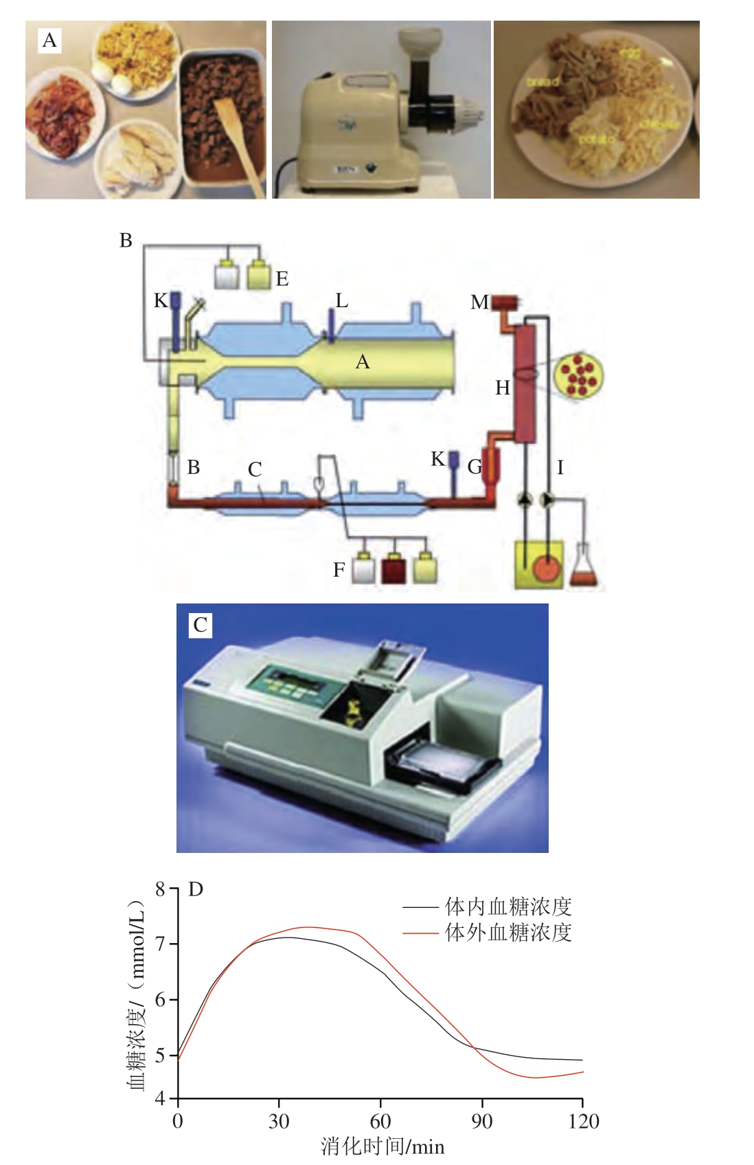TIMcarbo模型(图2A~C)[49]是动态体外消化测试食品餐后血糖反应的经典模型,其不仅模拟了口腔消化对血糖生成浓度的影响,同时还综合考虑了葡萄糖、果糖等物质在小肠的吸收过程。TIMcarbo模型操作步骤可概括为:1)待测食品经过机器粉碎模拟人口腔对食物的咀嚼作用后进入到动态的胃肠道模拟消化系统内,得到消化产物;2)消化产物经计算机自动分析,得到葡萄糖、果糖等物质的含量与时间的变化关系,并得到葡萄糖释放曲线。研究结果显示,TIMcarbo模型预测得到的血糖释放曲线与人体内血糖释放曲线高度一致(图2D),可用于研究待测食品样品对餐后血糖浓度的影响。