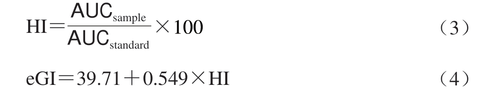 式中:i为单一或者复杂食品中的基本营养成分数(i=1,2,3…);Ci(i=1,2,3…)为第i种营养素所含可利用碳水化合物的含量;GIi(i=1,2,3…)为第i种营养素的GI值。