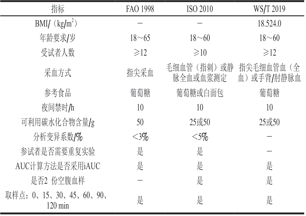 指标FAO 1998ISO 2010WS/T 2019 BMI/(kg/m2)--18.524.0年龄要求/岁18~6518~6018~60受试者人数≥12≥10≥12采血方式指尖采血毛细血管(指刺)或静脉全血或血浆测定指尖毛细血管血(全血)或手背/肘静脉血参考食品葡萄糖葡萄糖或白面包葡萄糖夜间禁时/h101010可利用碳水化合物含量/g5025或5025或50分析变异系数/%<3%<5%-参试者是否需要重复实验是是-AUC计算方法是否采用iAUC是是是是否2 份空腹血样-是是取样点:0、15、30、45、60、90、120 min是是是