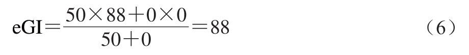 例如,一份由110 g白面包(GI值为88,可利用碳水化合物的质量为50 g,即C1=50,GI1=88)和30 g黄油(GI值为0,可利用碳水化合物的质量为0,即C2=0,GI2=0)组成的混合餐中,其eGI值计算如式(6)所示。