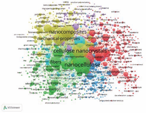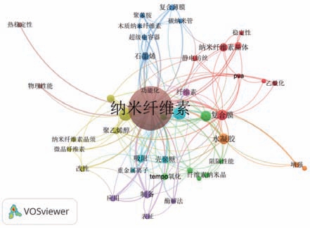 WoS数据库检索检索式:TS=(nanocellulose OR cellulose nanocrystals OR nanofibrillated cellulose OR microfibrillated cellulose OR bacterial nanocellulose OR cellulose nanowhisker OR cellulose nanofibril)OR TS=(nanocellulose)AND TS=(material OR ploymer OR compound)time span=1995—2021索引=SCIEXPANDED,论文类型选择Article。共检索到12 658 篇论文,将其导入VOSviewer软件对关键词进行可视化分析。