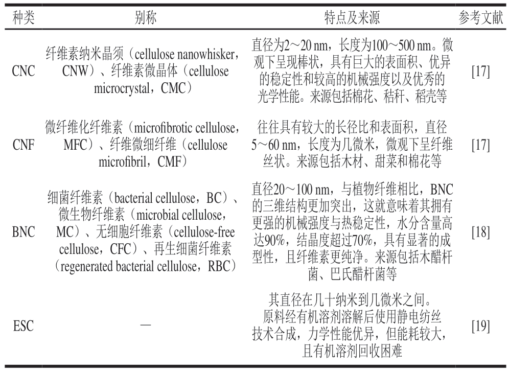CNC.纤维素纳米微晶(cellulose nanocrystal);CNF.纤维素纳米纤丝(cellulose nanofibrils);BNC.细菌纤维素(bacterial nanocellulose);ESC.静电纺丝纤维素纳米纤丝(electrospinning cellulose nanofibers)。