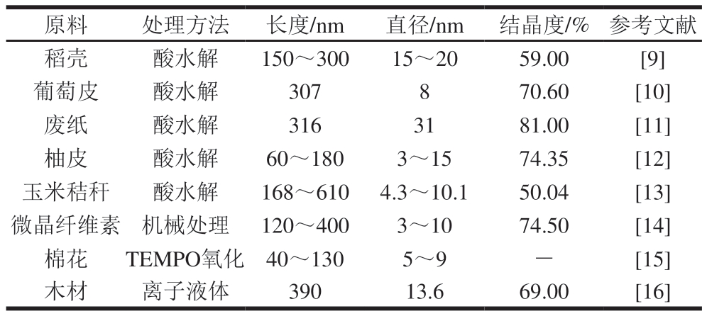 原料 处理方法 长度/nm 直径/nm 结晶度/% 参考文献稻壳 酸水解 150~300 15~20 59.00 [9]葡萄皮 酸水解 307 8 70.60 [10]废纸 酸水解 316 31 81.00 [11]柚皮 酸水解 60~180 3~15 74.35 [12]玉米秸秆 酸水解 168~610 4.3~10.1 50.04 [13]微晶纤维素 机械处理 120~400 3~10 74.50 [14]棉花 TEMPO氧化 40~130 5~9 - [15]木材 离子液体 390 13.6 69.00 [16]