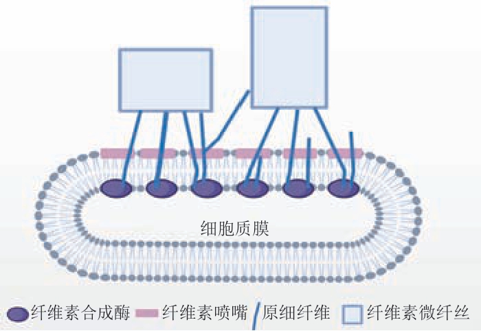 微生物法主要利用木醋杆菌、根瘤农杆菌、固氮菌属、根瘤菌等细菌合成BNC。BNC的合成是一个精密且复杂的过程,涉及大量单酶、复合催化及调节蛋白等[48]。以木醋杆菌为例,首先利用葡萄糖等作为碳源生成脲苷二磷酸葡萄糖,然后通过纤维素合成酶将葡萄糖聚合成无支链的长链(β-1,4-葡萄糖苷链),其中葡萄糖的聚合过程是一个重要的步骤,木醋杆菌形成的纤维素并不是细胞壁的一部分,而是通过细胞壁的纤维素喷嘴分泌到菌体外,并在体外不断积累聚合成NCC(图5)。BNC的化学结构和天然纤维素一样,但与植物纤维素相比没有半纤维素、果胶和木质素等杂质成分,因此具有更强的包裹能力和良好的生物降解性[49]。此外,BNC的一个重要特点是可以原位控制纤维素的形成,如通过调节菌种、反应器形状及构成、培养基组成等参数来优化生物合成过程中BNC产品的形状及其超分子结构。